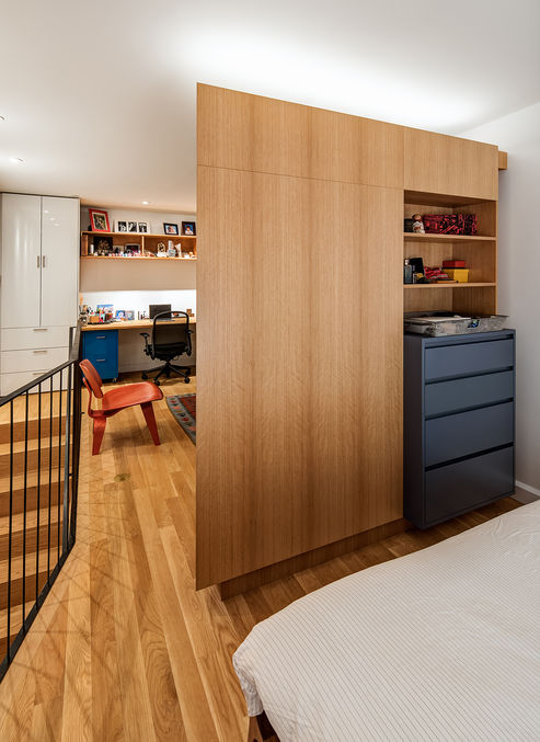 A combined, eat-in living/dining/kitchen space is enveloped with a ribbon of cabinetry providing storage while maximizing use and movement. A sculptural white oak stair flanks the two story back wall at the entry and a glass floor/skylight brings natural light from above to a brass pendant light and kitchen table below. Upstairs, the master bedroom and a home office are separated by a two sided, bookcase/armoire with integrated up-lighting. A planted terrace is accessed from this floor with views of the Brooklyn Heights neighborhood and Manhattan beyond.