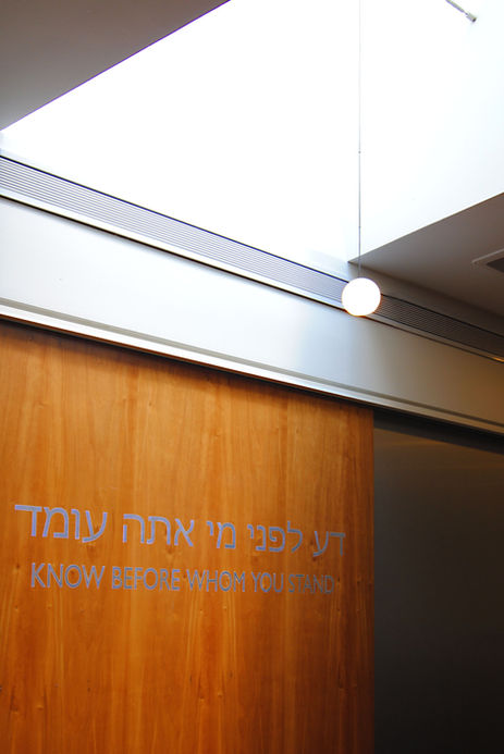 This renovation and extension provides classroom, office and worship areas to the existing temple. The layered zinc wall provides muted views from the classrooms within, and pin-up space for class presentations. A subterranean temple for smaller gatherings was created that incorporates a wooden and inlaid steel ark for holding the torah and a single light suspended from the skylight above.